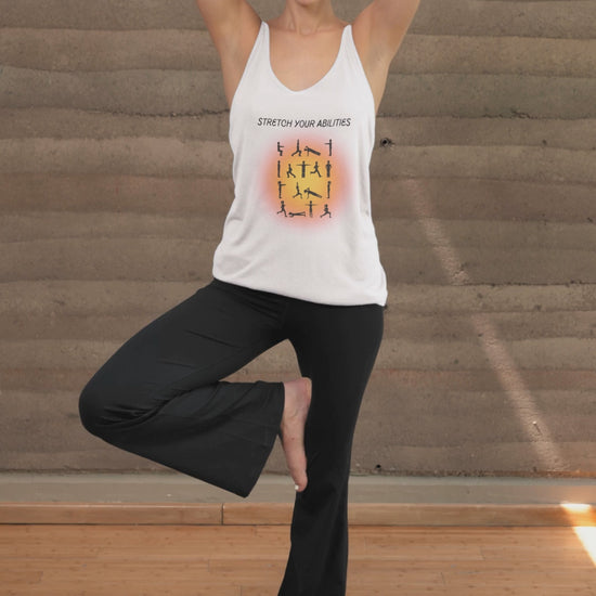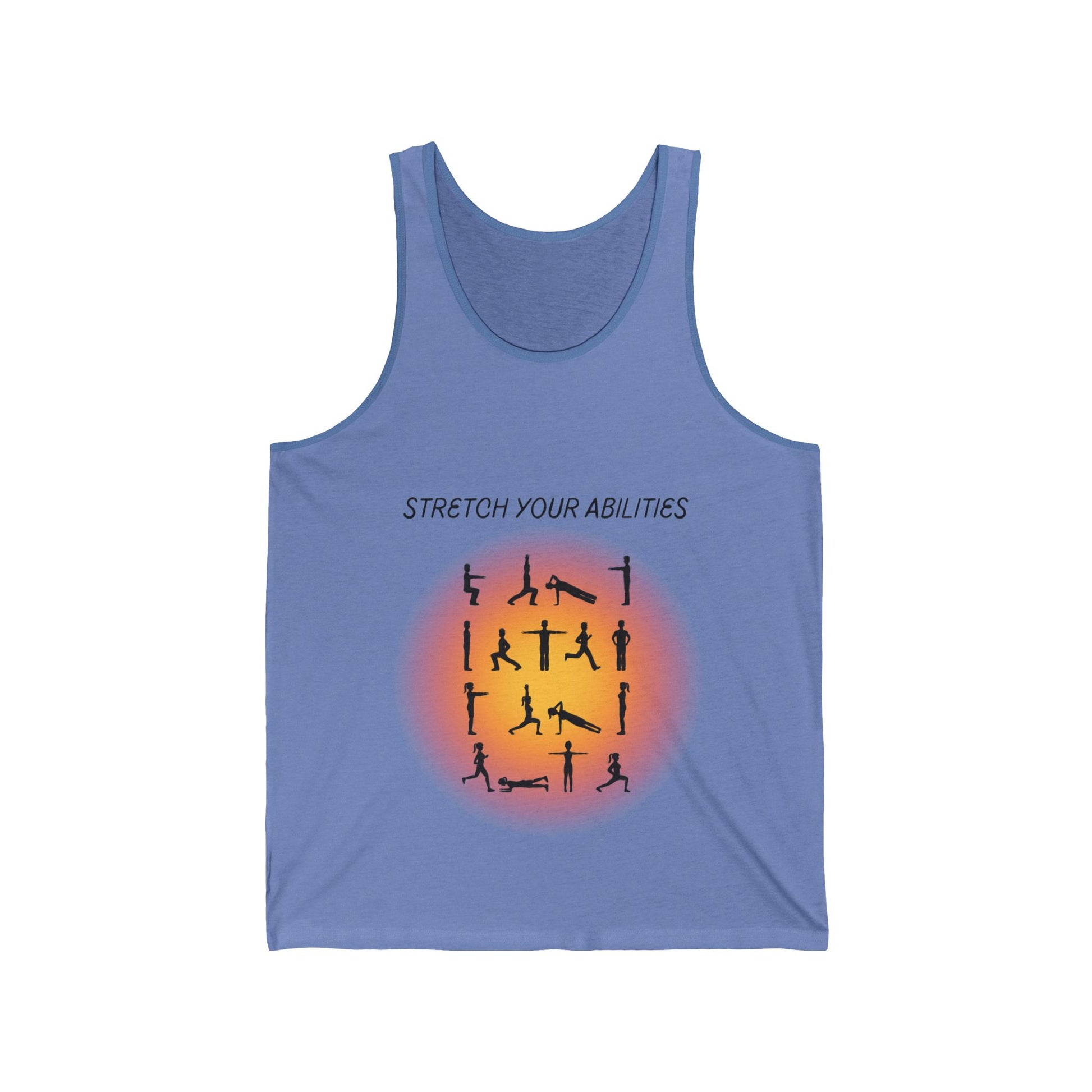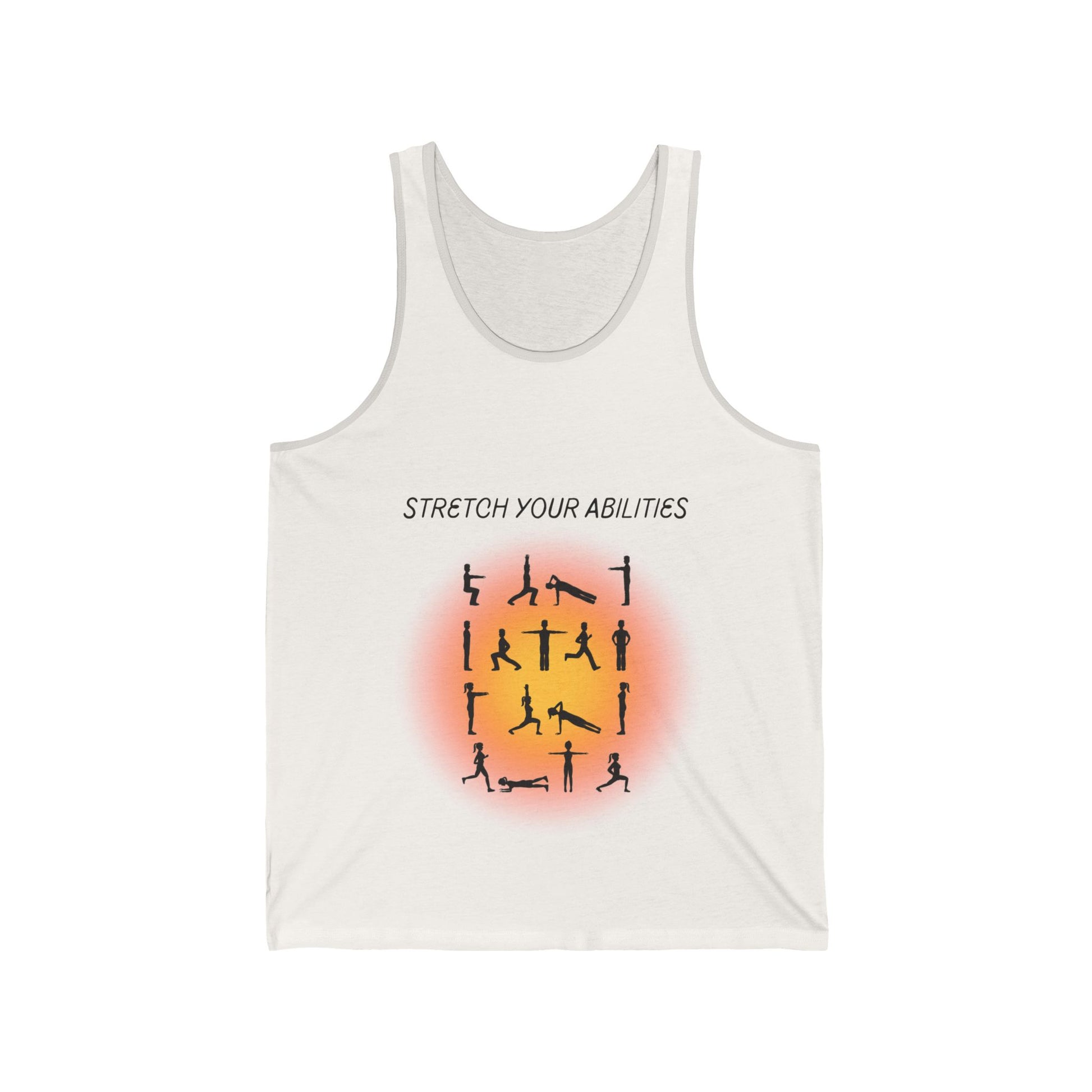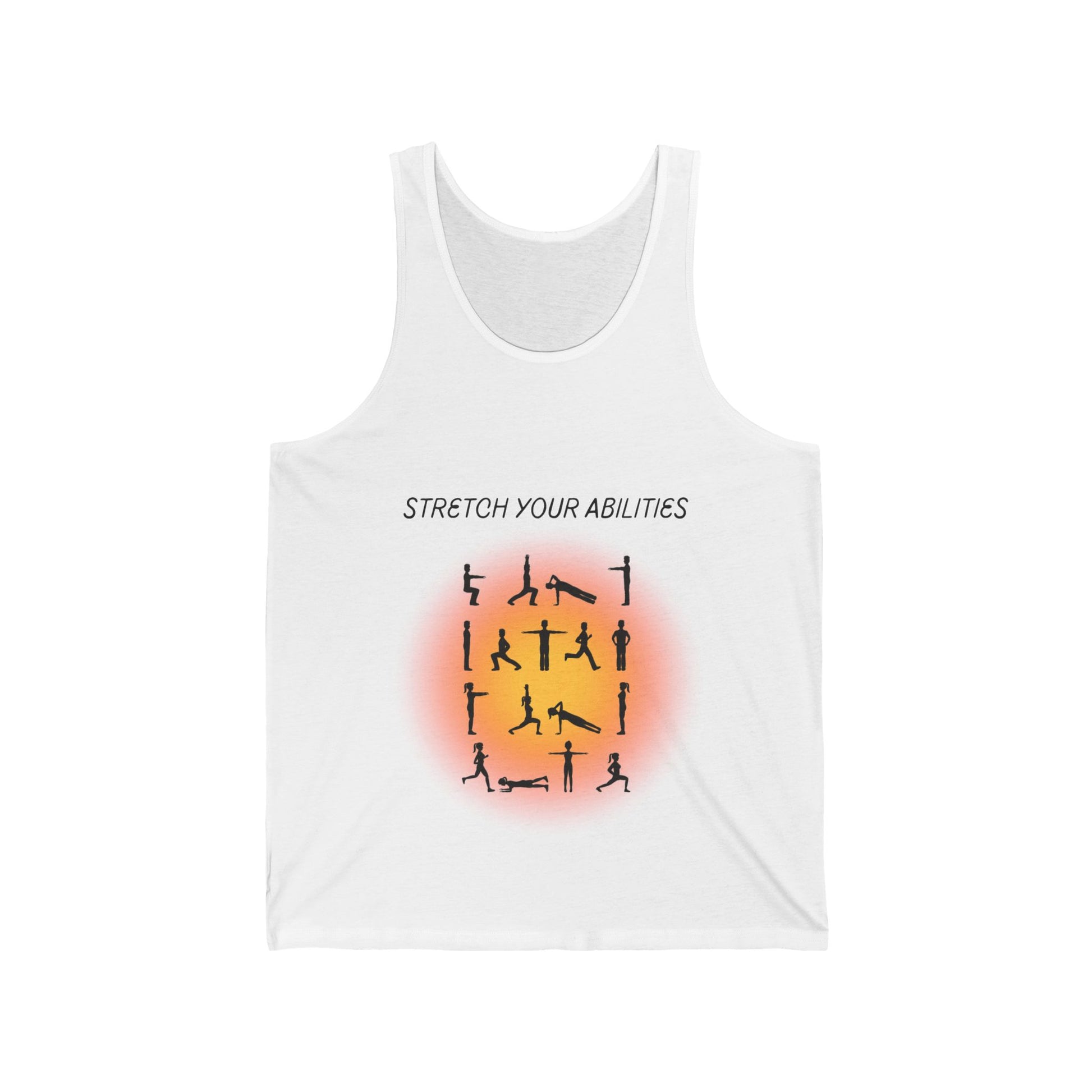 This tank top is a celebration of growth — in body, mind, and spirit. Featuring tiny figures stretching and moving, it reminds you that stretching your abilities takes time, practice, and patience.