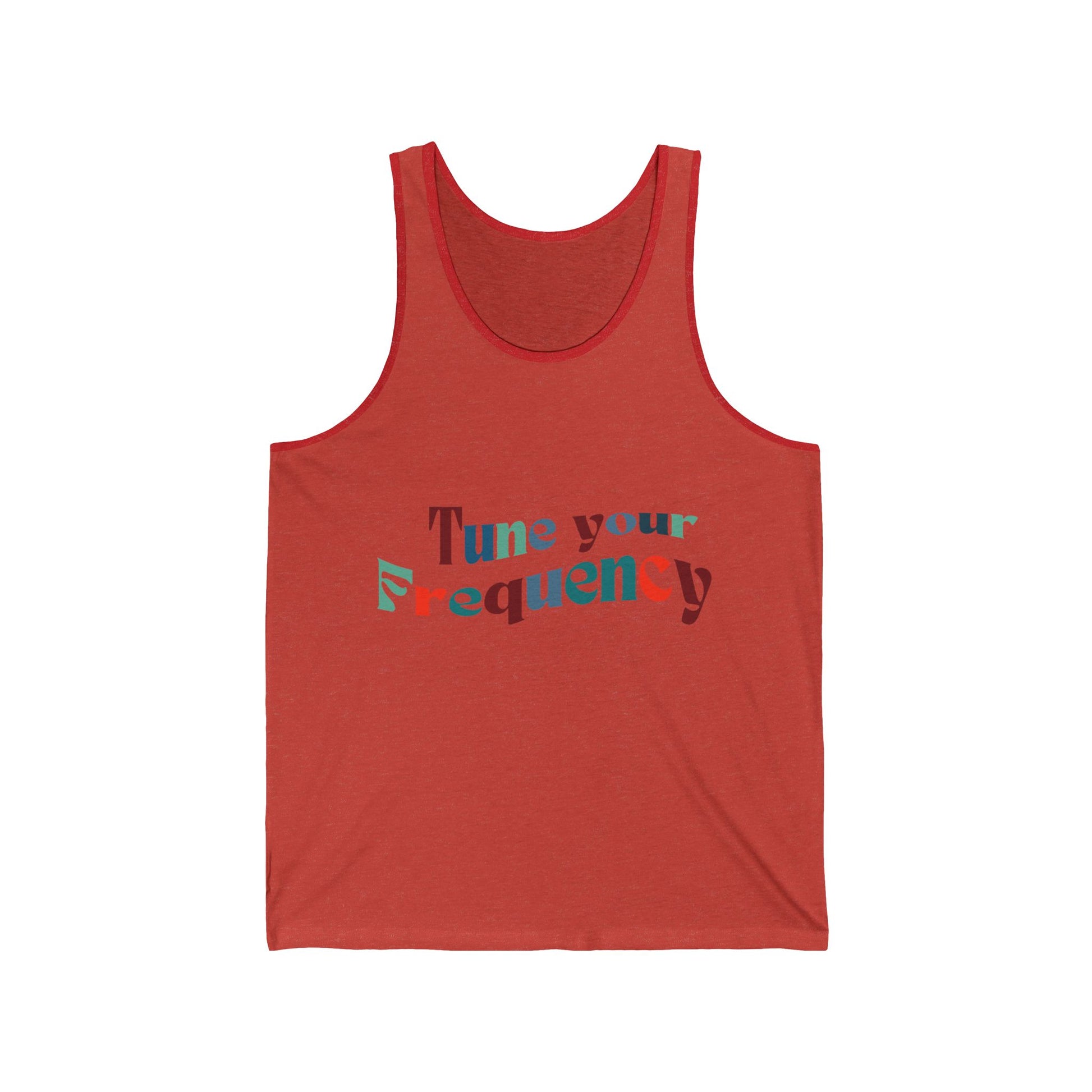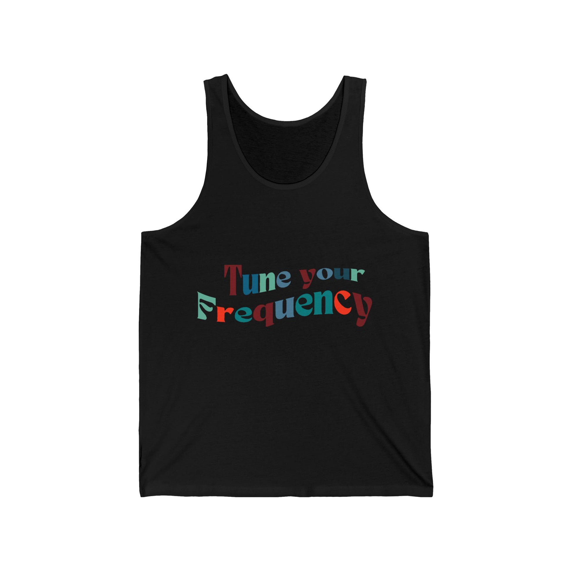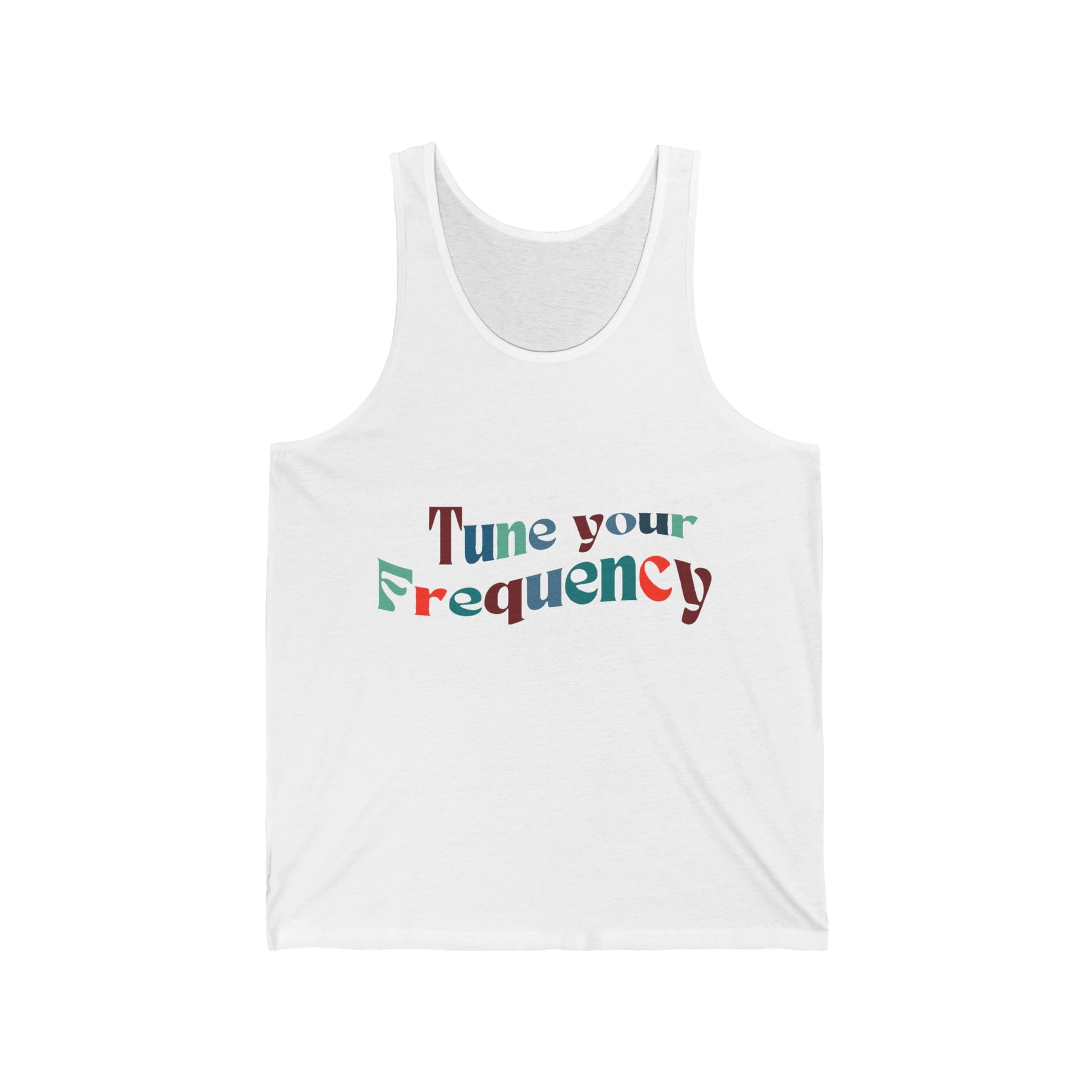 Elevate your summer wardrobe with this stylish Unisex Jersey Tank. Crafted for ultimate comfort, this tank features a lightweight design that feels soft against your skin, making it perfect for hot days and laid-back evenings. With its eye-catching phrase, 'Tune your Frequency,' this tank creates a positive vibe that resonates with those who love self-expression and music. It's an ideal addition to beach outings, festivals, or casual hangouts with friends. This tank is relevant for anyone looking to make a statement, especially during summer celebrations, music events, or just sunny days at the park. Its easy-going style and relaxed fit make it perfect for adults seeking both comfort and trendiness.